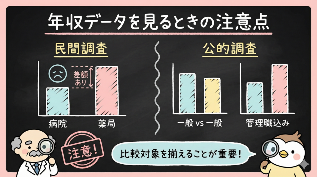 公的調査だと「一般薬剤師同士」で比べれば病院のほうが高いが、「管理薬剤師」を含めると薬局が上回る——という構図になります。