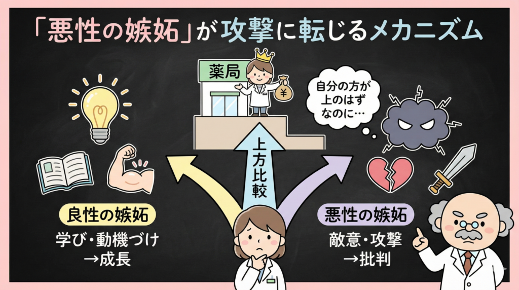病院薬剤師には「自分は高度医療を担っている」「臨床能力は薬局より上だ」という自負を持つ方もいます。その自負があるからこそ、待遇面で差があると「学び」ではなく「攻撃」に転びやすくなる。実証研究でも、職場での上方比較が悪性の嫉妬や敵意につながるケースが報告されています。