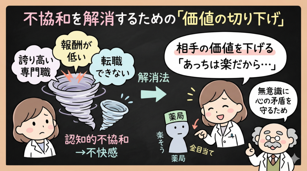 - 認知的不協和:転職しない自分を正当化するため、相手の価値を下げる