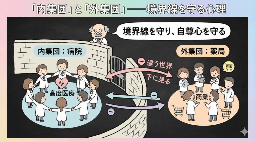 「病院=高度医療」「薬局・ドラッグストア=商業」という語りは、単なる事実描写ではありません。集団同一性を守るための境界線として機能しています。