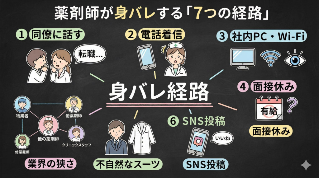 この不安、めちゃくちゃわかります。薬剤師業界、狭いですからね。学会で顔を合わせる、卸のMSが同じ、薬剤師会の研修で隣の席——つながりが多すぎて、どこから漏れるかわからない怖さがあります。