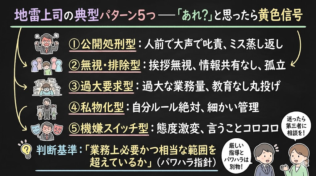 まず、「自分の上司がどのタイプの地雷なのか」を整理するところから始めましょう。友人たちの話を集約すると、だいたい5パターンに分類できます。