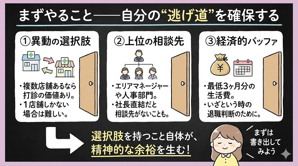 ここで言う「逃げ道」は、退職という意味だけじゃありません。異動の可能性、相談できる上位者の有無、経済的なバッファ——この3つのうち、どれが使えるかを先に把握しておくことです。