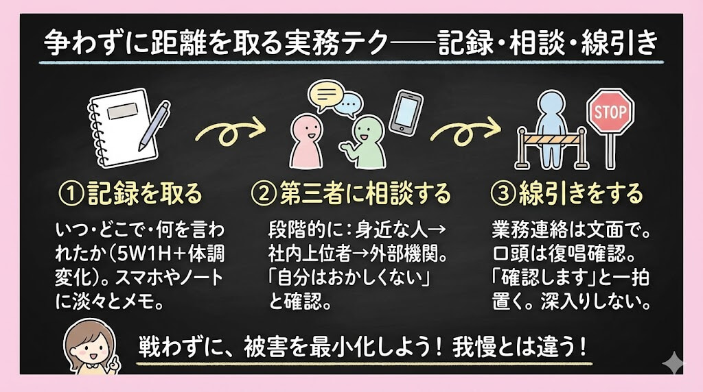 - 記録を取り、第三者に相談し、距離を取る——この順番で進める