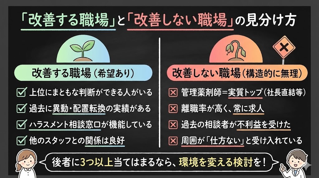 一つ補足すると、”改善する職場”でも、改善までに数ヶ月〜1年かかることはあります。その間、自分の心身がもつかどうかも判断材料に入れてください。改善の可能性があっても、自分が壊れたら意味がありませんからね。
