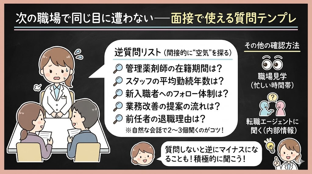 | 「管理薬剤師の方はどのくらいの期間、この店舗にいらっしゃいますか?」 | 在籍期間が極端に短い=問題ありの可能性 |