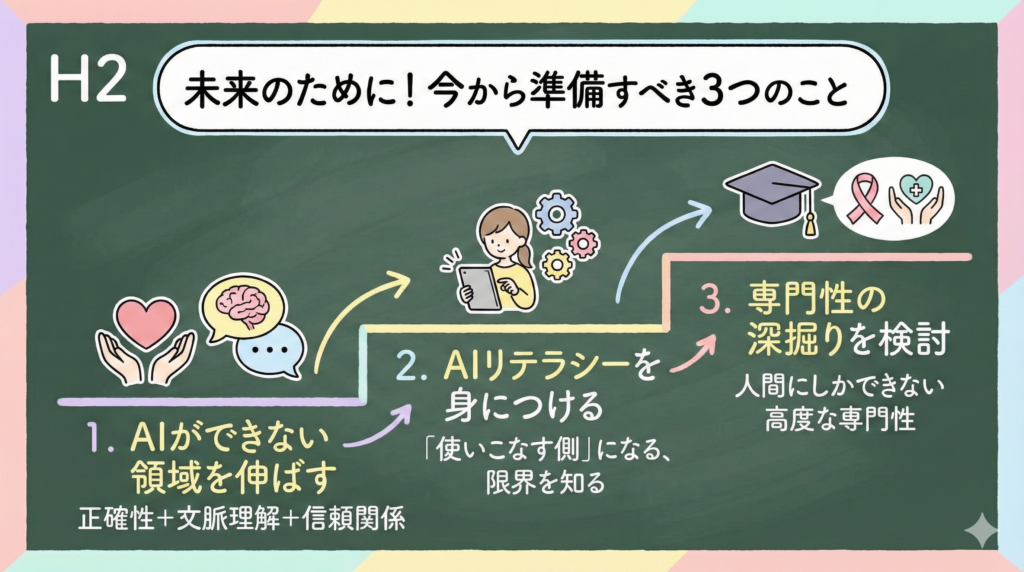 これらの領域は、AIが学習しにくいノウハウと経験が求められます。認定薬剤師や専門薬剤師の取得も、選択肢の一つです。