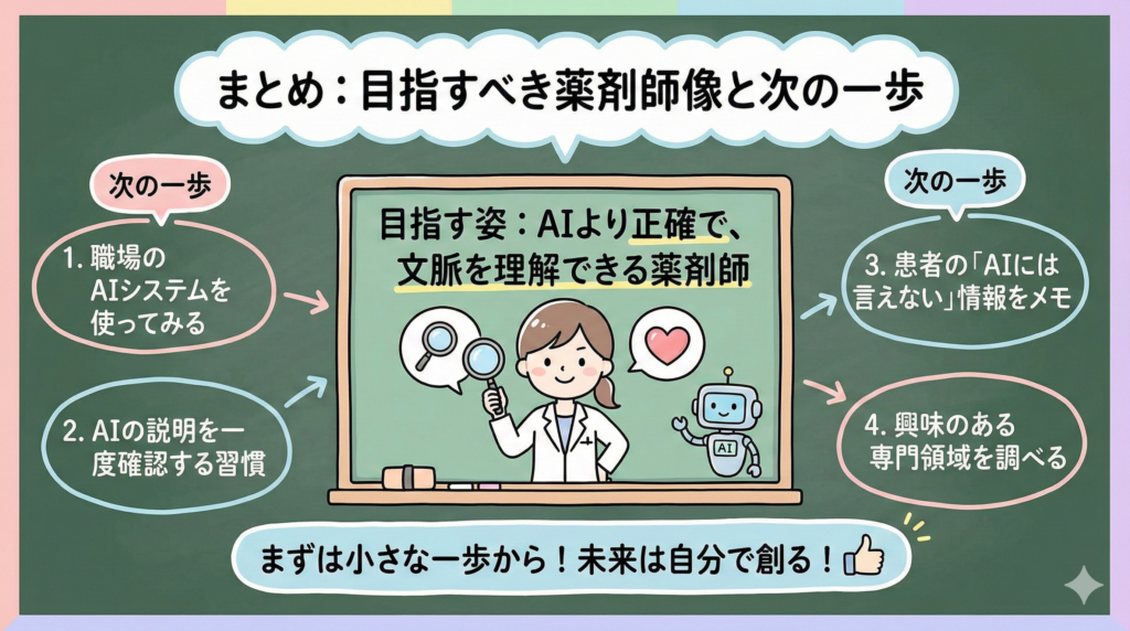 不確実な未来に備えるには、まず現実を知ることです。AIの進化は速いですが、専門医が正確性の観点からAIの限界を認識しているように、人間にしかできないことも確実にあります。その境界線を見極めながら、自分の立ち位置を調整していく—それが、これからの薬剤師に求められるスキルです。