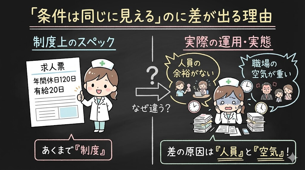 でも、いざ入職してみたら話が違った、というのは珍しい話ではありません。私がこの記事で伝えたいのは、求人票の”制度”と職場の”運用”にはギャップがあるということ。そして、そのギャップは事前に見抜けるポイントがあるということです。