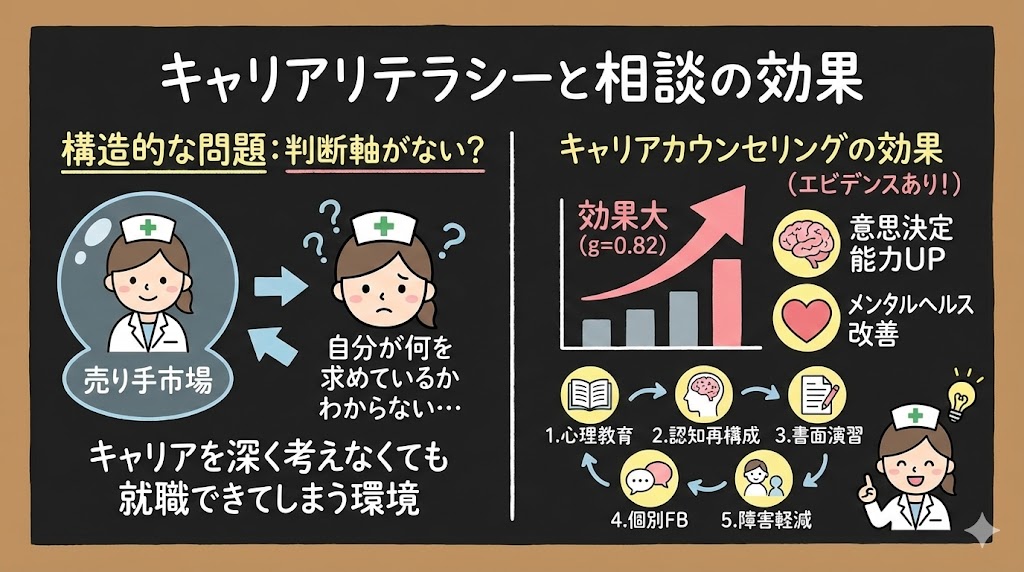- キャリアアウトカム(意思決定能力、キャリア適応力など)への効果量:g = 0.82(大きい効果)