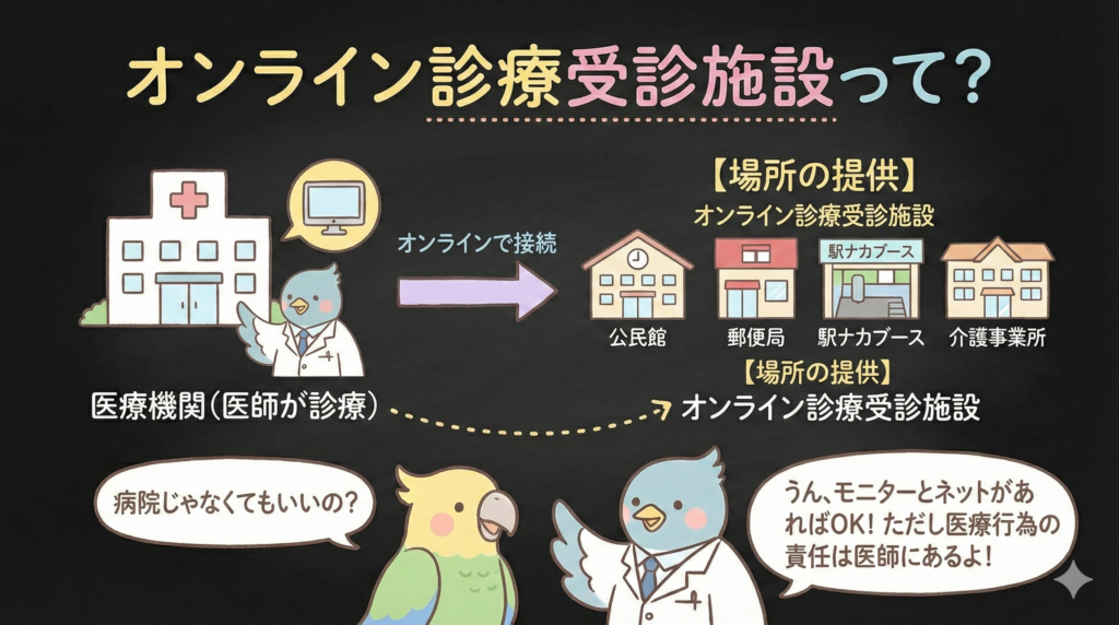 具体的には、公民館、郵便局、駅ナカブース、職場、介護事業所などが想定されています。医療機関ではなく、あくまで「患者が診療を受ける場所を提供する施設」という位置づけです。