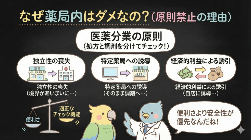 独立性の喪失薬局と医療機関の一体的な構造・経営が禁止されているのに、薬局内で診療が行われると境界があいまいになる