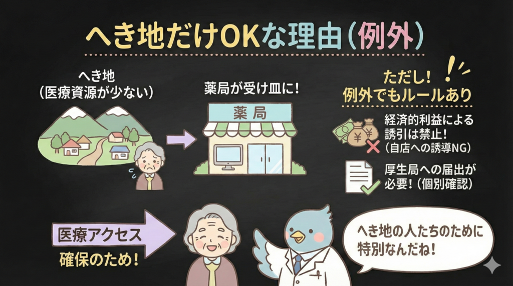 原則禁止とはいえ、例外が設けられました。医療計画上のへき地(無医地区または準無医地区)にある薬局については、一体的な構造・経営の禁止が適用されず、薬局内へのオンライン診療受診施設の設置が認められます。