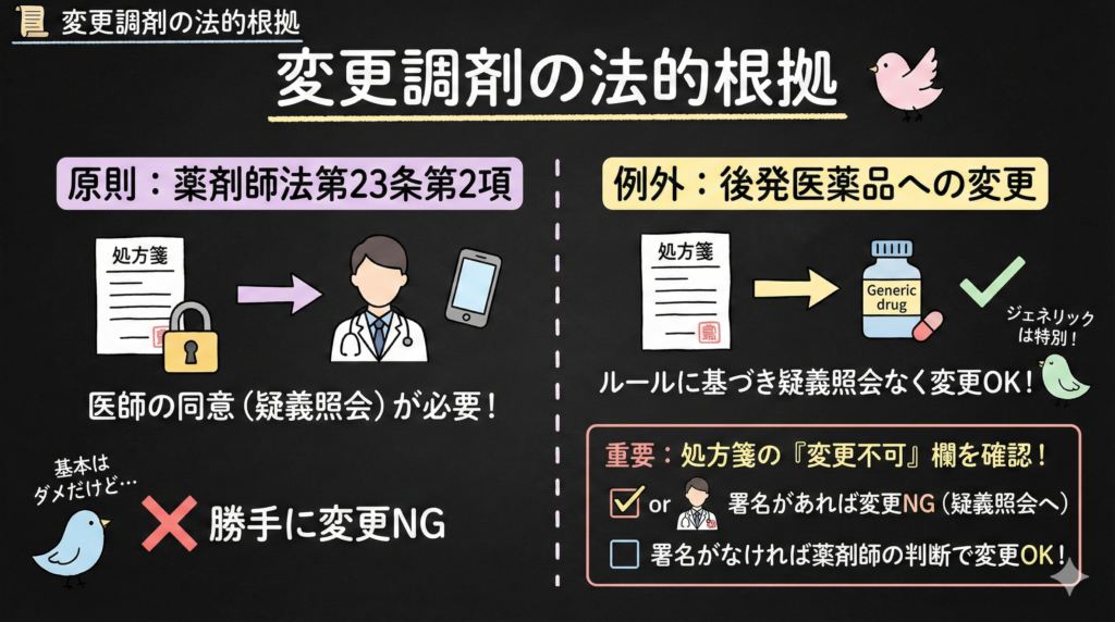 ただし、後発医薬品への変更については、ルールに基づき疑義照会なく変更が可能とされています。