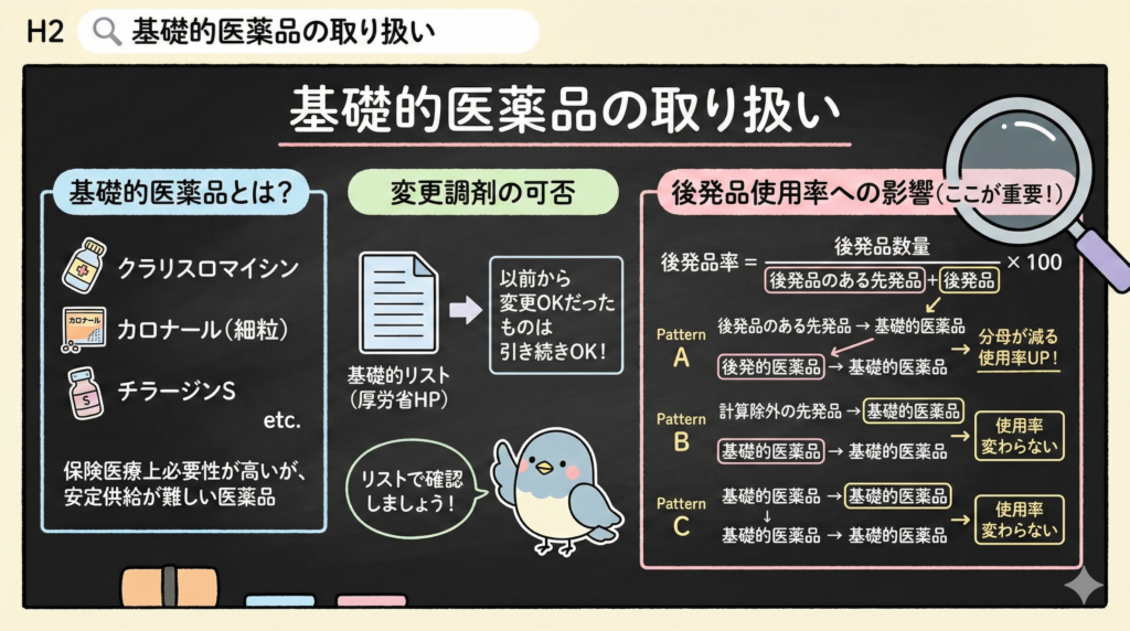 パターンB:計算除外の先発品(フロモックス等)→ 基礎的医薬品