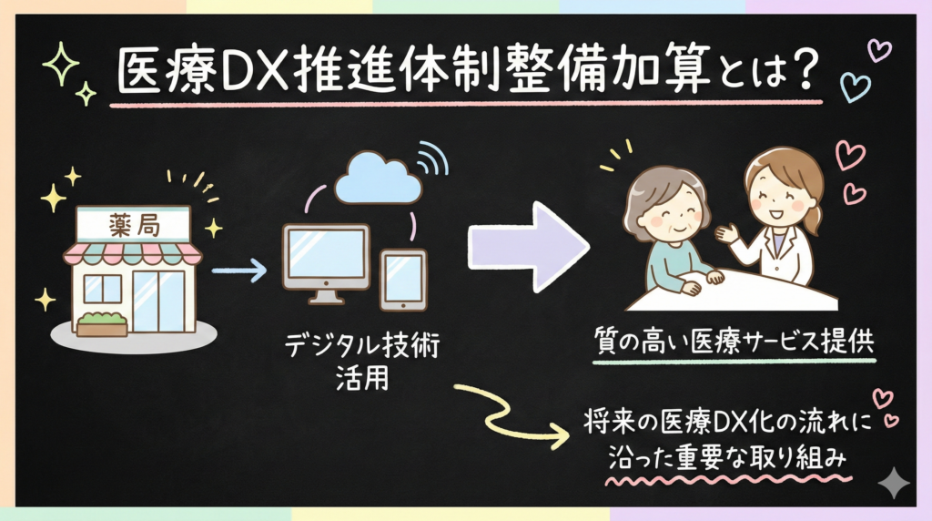 医療DX推進体制整備加算は、薬局がデジタル技術を活用して質の高い医療サービスを提供するための体制を整備していることを評価する加算です。2024年度調剤報酬改定で新設され、その後も段階的に見直しが行われています。