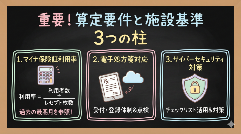マイナ保険証の利用率向上と電子処方箋対応が特に重要なんですね!早めに取り組まないと間に合わなくなりそうです。
