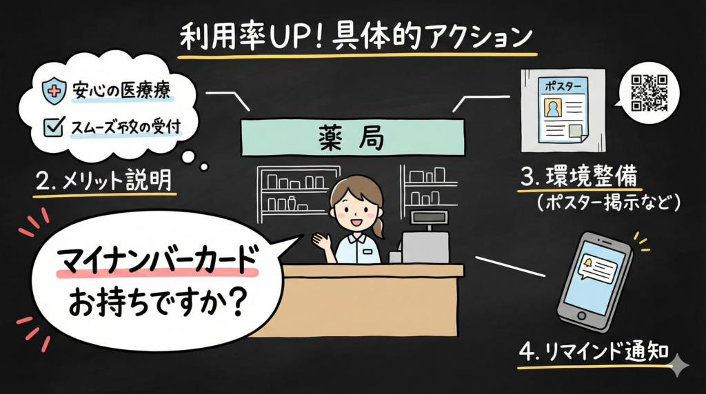 利用率向上に最も効果的なのは、受付での積極的な声掛けです。「保険証をお持ちですか」ではなく、「マイナンバーカード(マイナ保険証)をお持ちですか」と直接聞くことで、利用を促進できます。