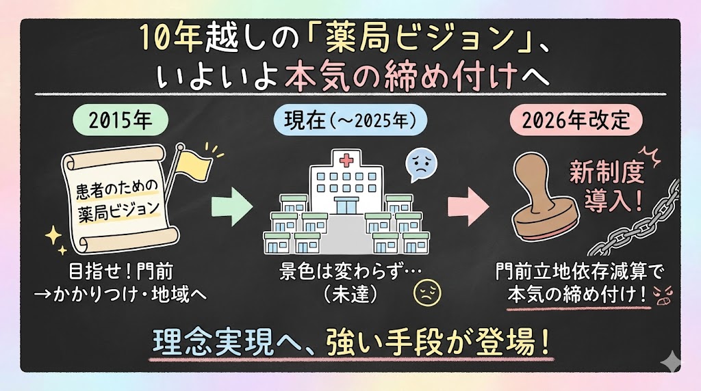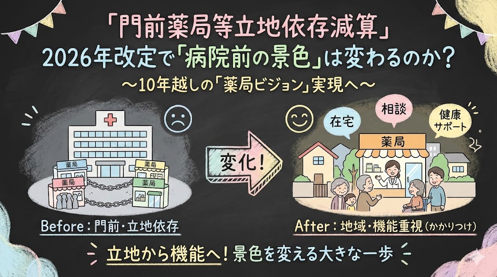 2026年度の調剤報酬改定は、地域偏在の解消と門前薬局のあり方の見直しが大きなテーマです。特に「門前から地域へ」という薬局ビジョンが達成されていない現状が厳しく指摘されています。厚労大臣自身が「薬局ビジョン未達」と明言するなか、今回の改定で登場したのが「門前薬局等立地依存減算」という新たな仕組みです。