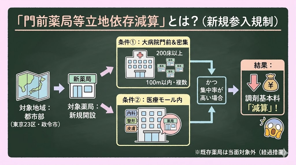 2026年度の調剤報酬改定で新設される「門前薬局等立地依存減算」は、都市部において、新規開設する薬局が大病院門前や医療モールに立地する場合に調剤基本料を減算するという制度です。