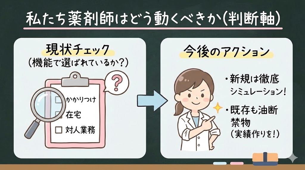 私ならまず、自分の薬局が「立地」に依存しているのか、「機能」で選ばれているのかを冷静に見つめ直します。