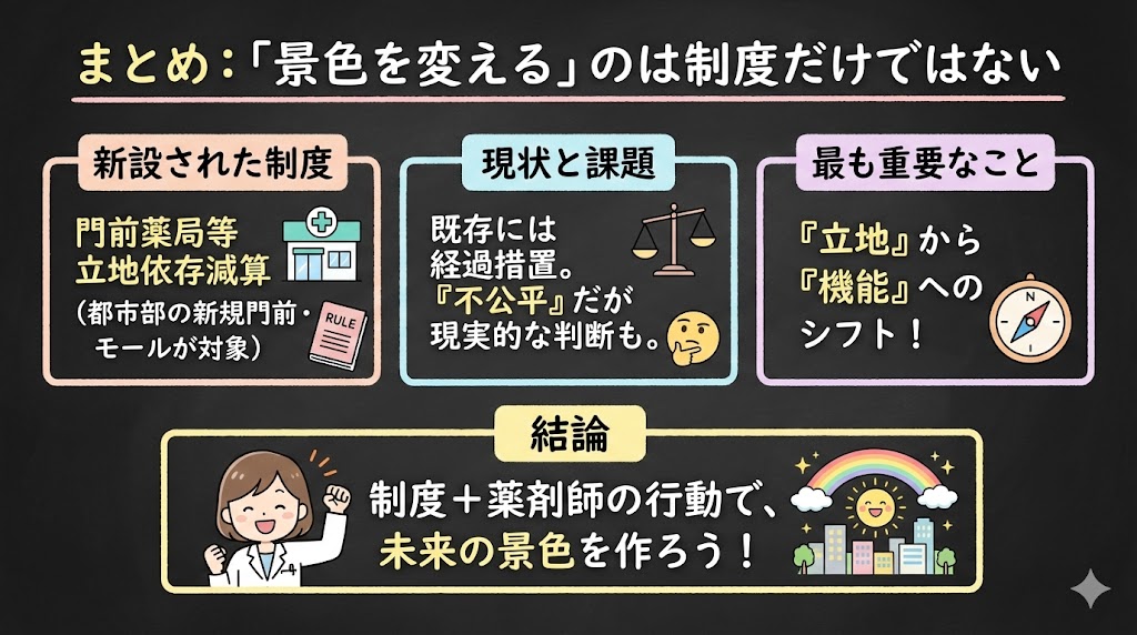 「既存薬局ひいき」という批判には一定の根拠があります。同じ立地条件でも新規と既存で扱いが異なるのは、公平性の観点から疑問が残ります。一方で、既存薬局への急激な規制は地域医療に混乱をもたらすという現実的な判断もあるでしょう。
