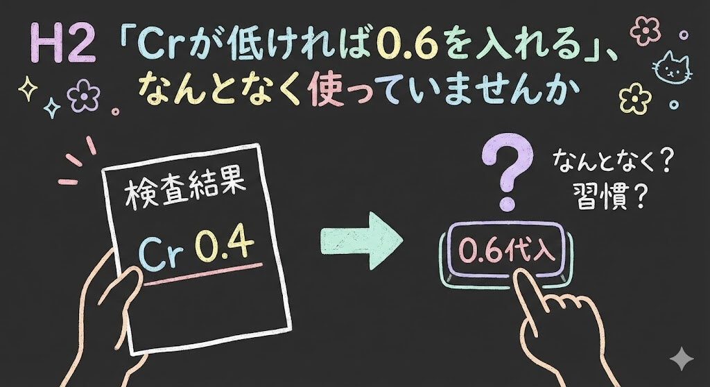 高齢の患者さんで血清クレアチニン(Cr)値が0.4 mg/dLだった。eGFRを計算したら妙に高い数字が出た。「こういうときは0.6を代入して計算し直す」——そう教わった方、多いのではないでしょうか。