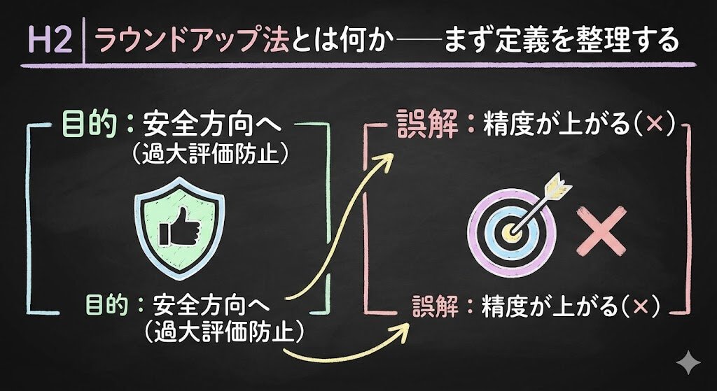 整理しましょう。ラウンドアップ法は「精度向上」ではなく「安全方向へのバイアス」です。