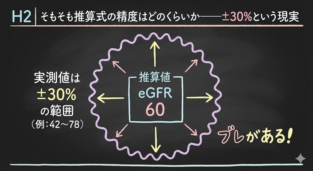 日本人向けeGFR推算式(JSN eGFR)の正確度は、75%の症例が実測GFRの±30%の範囲に入る程度と報告されています。逆に言うと、4人に1人はそこから外れる。しかも「入る」と言っても±30%です。