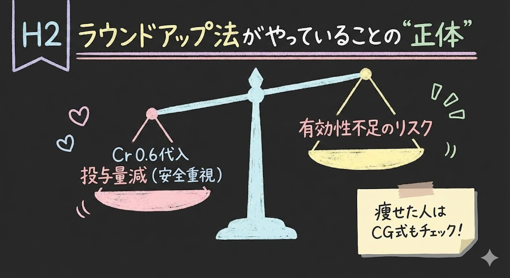 目的はシンプルです。高齢者で筋肉量が減っている場合、Crの産生自体が少なくなります。すると血清Cr値が見かけ上低くなり、推算式に入れるとeGFRが高く出すぎてしまう。つまり腎機能を過大評価するリスクがある。これを防ぐために、Crに下限値を設定して「高く出すぎないようにする」のがラウンドアップ法の狙いです。