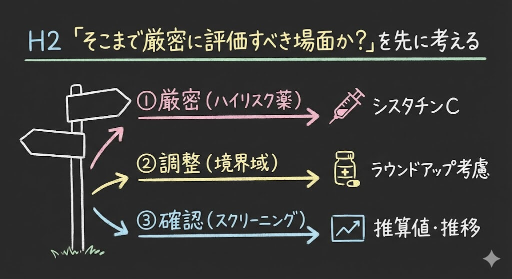 シスタチンCは測定可能か。過去のCrの推移はあるか。蓄尿は可能な状況か。すべてが使えないなら、ラウンドアップ法は「安全方向に寄せる次善の策」として選択肢に入ります。 - Step 4:「精度を上げた」と思い込まない