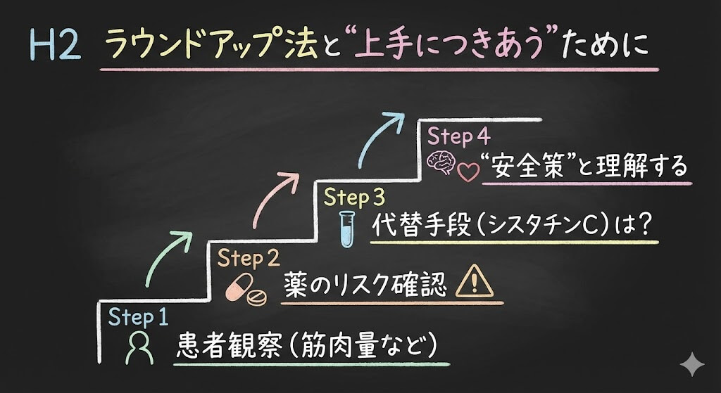 → ここはラウンドアップで済ませず、シスタチンCや実測CCrの検討を提案する場面です。過量投与も過少投与も命に関わります。