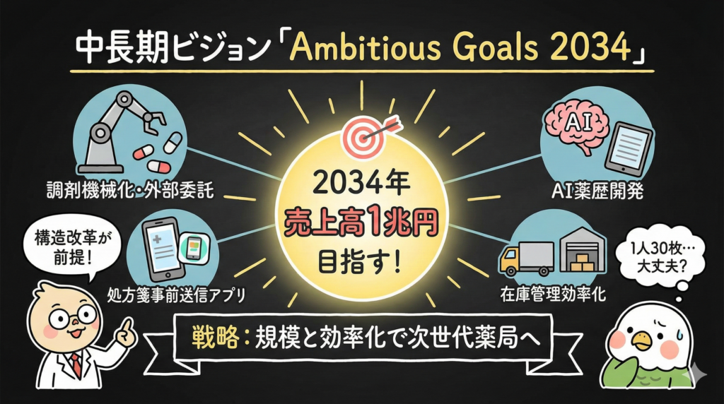 2025年3月、アインホールディングスは中長期ビジョン「Ambitious Goals 2034」を発表しました。2034年に売上高1兆円を目指すという、かなり野心的な目標です。