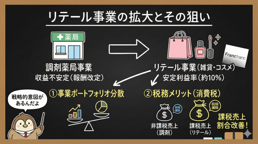 これは少し専門的な話ですが、調剤報酬は「非課税売上」に該当します。非課税売上の割合が高いと、仕入れにかかった消費税を控除できる金額が制限されます。リテール事業(課税売上)を拡大することで、この「課税売上割合」を改善し、消費税負担を軽減できる可能性があります。