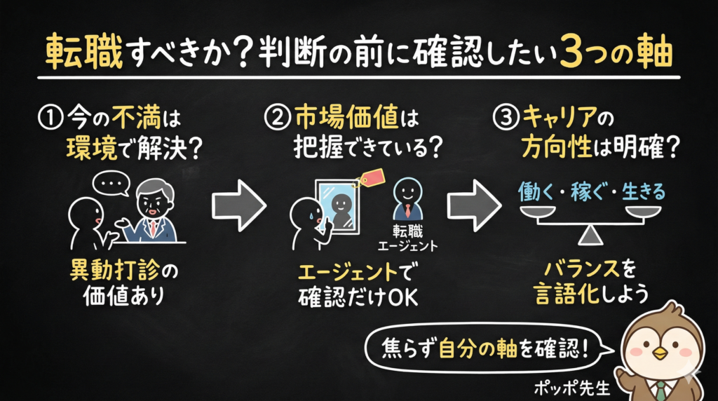 働く・稼ぐ・生きる——この3つのバランスが崩れているとき、人は転職を考えます。どの軸が崩れているのか、まず言語化してみてください。