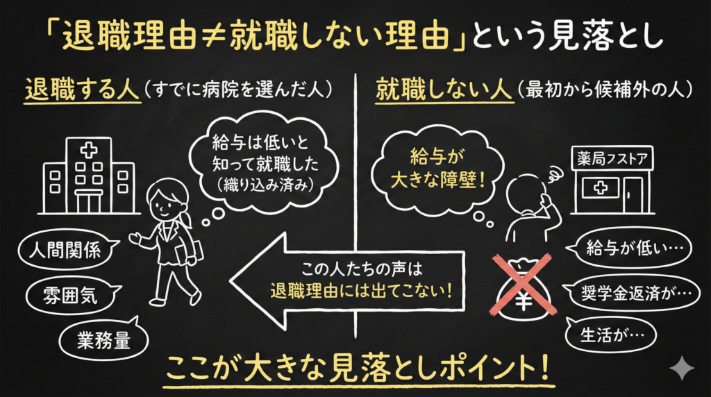 元の発言では「病院を退職した理由で給与を挙げた人が少ないから、給与は病院薬剤師不足の原因じゃない」という論理でした。でも、よく考えてみてください。