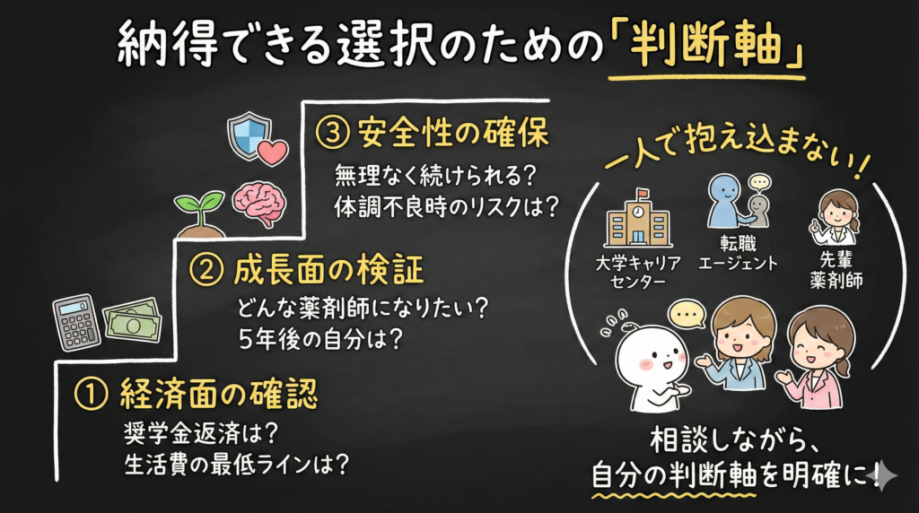 難しいです。だからこそ、一人で抱え込まないことが大事なんです。大学のキャリアセンター、転職エージェント、先輩薬剤師…信頼できる人に相談しながら、「自分の判断軸」を少しずつ明確にしていくのがいいと思います。
