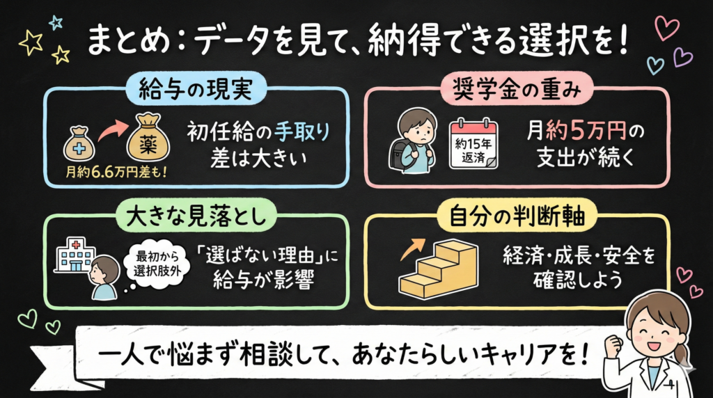 ただし、「だから病院は選ぶべきじゃない」という話ではありません。経済面をクリアできるなら、病院薬剤師は非常に魅力的な選択肢です。