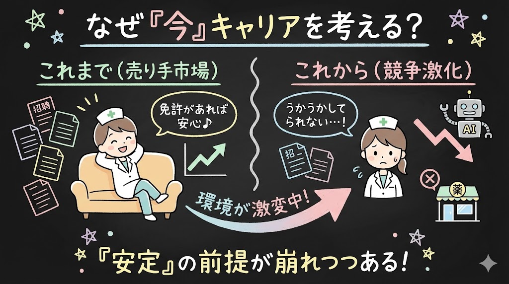 この記事では、薬剤師がキャリアについて「いつ」「何を」考えればいいのか、業界の変化を踏まえながら整理していきます。焦る必要はありませんが、「早すぎる」くらいで考え始めるのがちょうどいい理由を、一緒に確認していきましょう。
