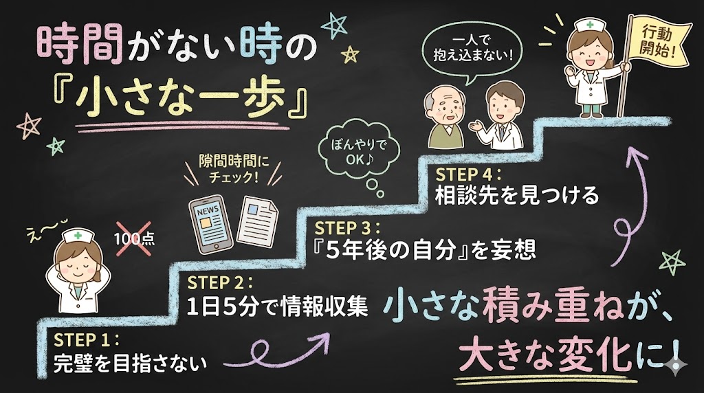 十分です。大きな判断は、小さな情報収集の積み重ねから生まれます。いきなり転職を決めたり、資格を取ったりしなくていい。まずは”知る”ことから始めましょう。