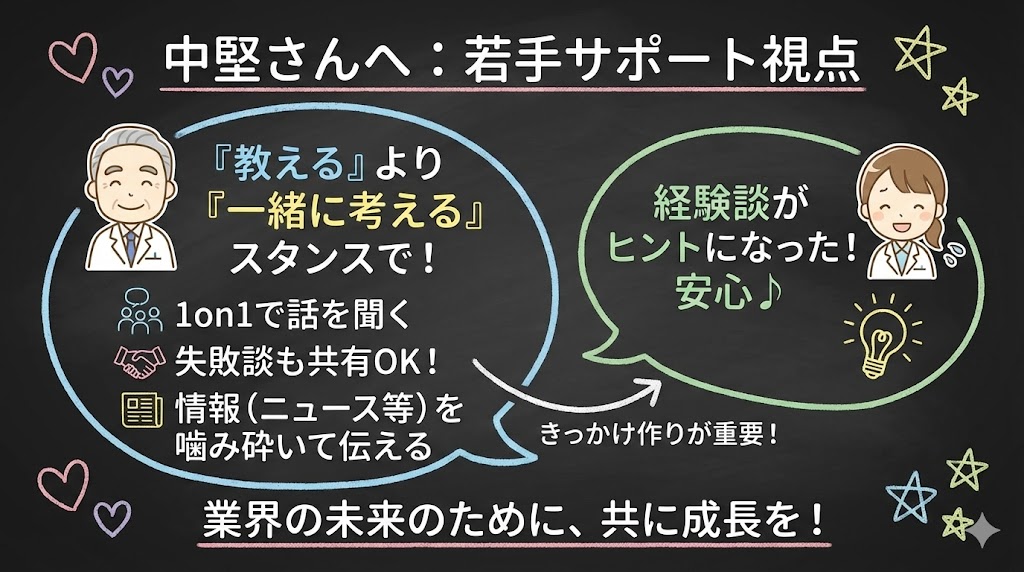 “教える”というより、“一緒に考える”スタンスでいいと思います。自分の経験や迷いを共有するだけでも、若手にとっては大きなヒントになりますから。