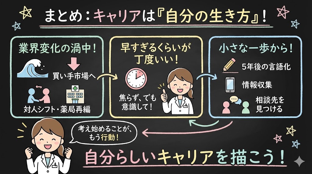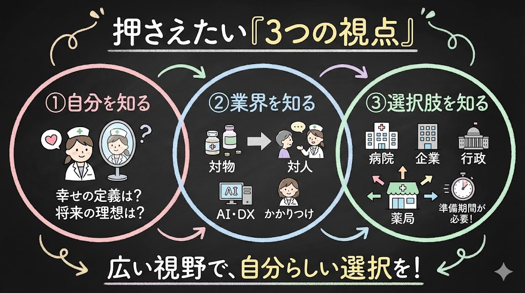 ただし、選択肢を広げるには「準備期間」が必要です。認定薬剤師や専門薬剤師の資格取得、在宅医療の経験、マネジメント経験など、「いつか」と思っていると、いざ動きたいときに動けないことがあります。
