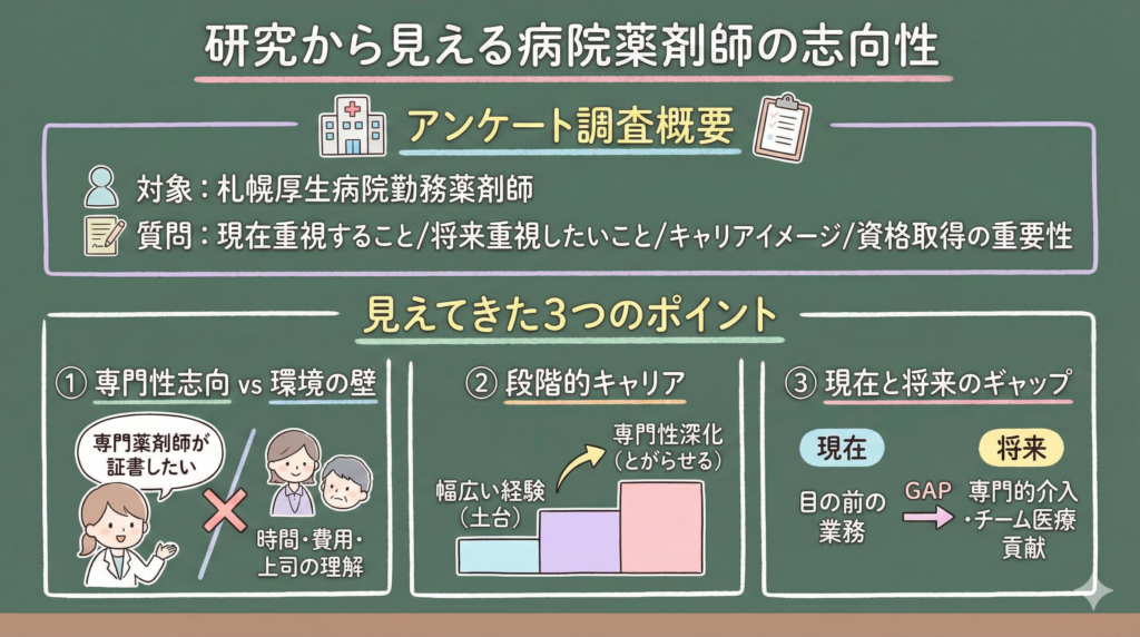 実は、札幌厚生病院が行った調査から、病院薬剤師がどのようなキャリア形成を思い描いているのかが明らかになっています。この記事では、その研究結果をもとに、病院薬剤師の志向性を整理し、そこから「自分のキャリアをどう考えるか」のヒントを抽出していきます。