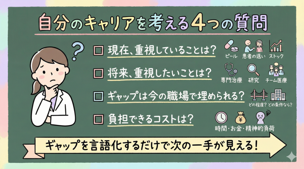 ギャップを言語化すると、「何が足りないのか」「何があれば埋まるのか」が明確になります。そうすれば、転職するにしても、今の職場で交渉するにしても、判断軸ができます。