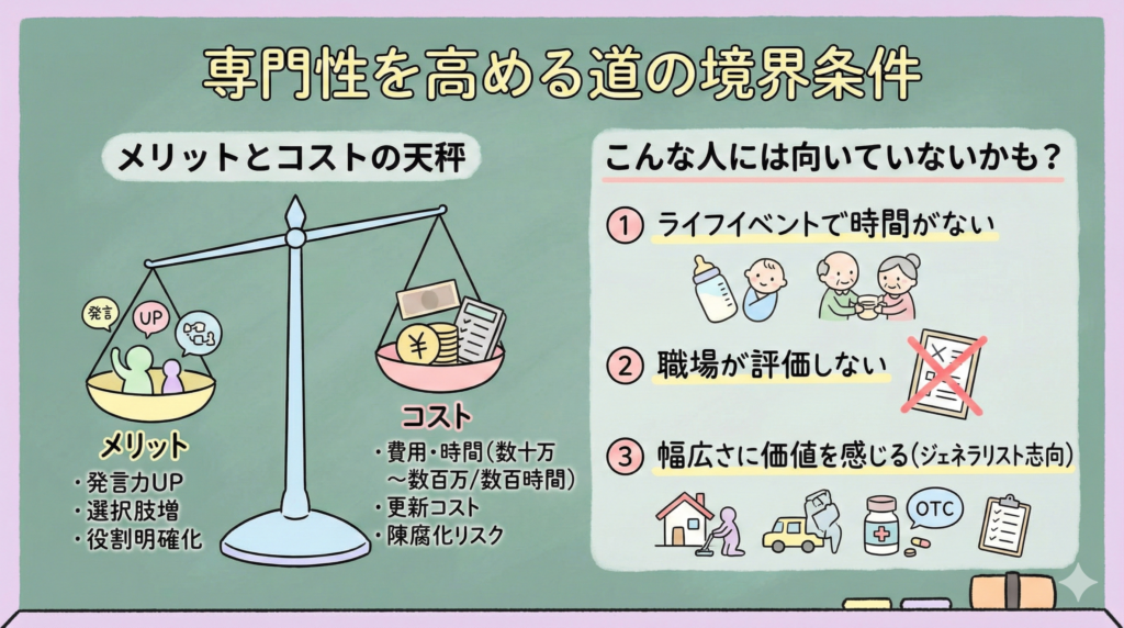 病院薬剤師の多くが専門性志向であることは確認できました。ただし、「専門性を高める=正解」と短絡的に考えないほうが安全です。専門性を高める道にも、明確な境界条件があります。