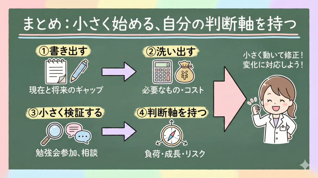 私としては、「完璧な答えを出してから動く」よりも、「小さく動いて修正する」ほうが現実的だと考えています。キャリアは一度決めたら変えられないものではなく、検証しながら調整していくものです。