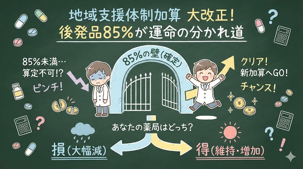 地域支援体制加算の見直し確定|後発品85%が前提条件に。算定できなくなる薬局と、点数試算で見えた意外な損益