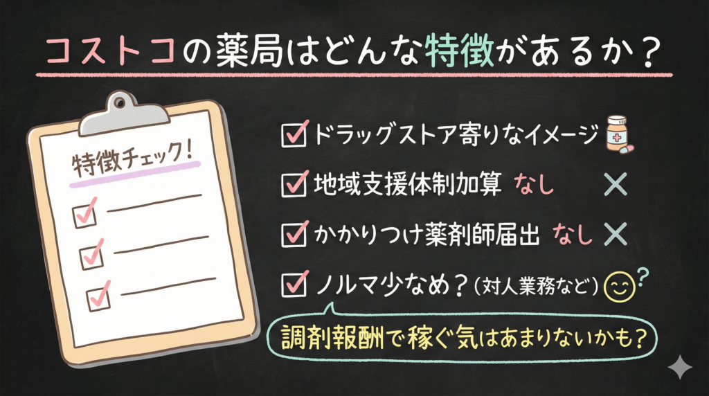 コストコ内の薬局は、地域支援体制加算も取得していませんし、かかりつけ薬剤師指導料の届け出もないため、対人業務を算定するための会社からのノルマはなさそうです。(在宅もないところがほとんどです)