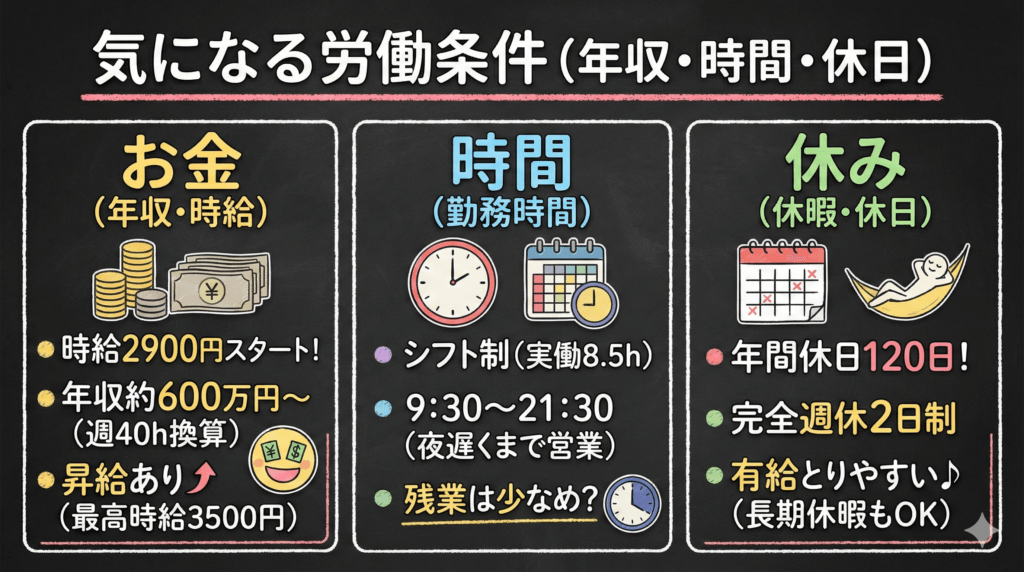 そして給与面では時給で2900円(週40時間計算とすると年収600万)と、悪くない給与だと思います。