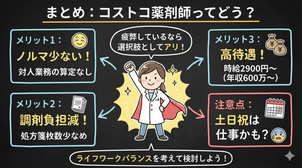 薬剤師としての仕事面でやりがいとか、長い目で見たときの薬剤師としてキャリアを考えると、すべての薬剤師にオススメ出来るものではないかもしれませんが、大手調剤チェーンで薄給で疲弊しているようなら選択肢として悪くないのではないかと思います。